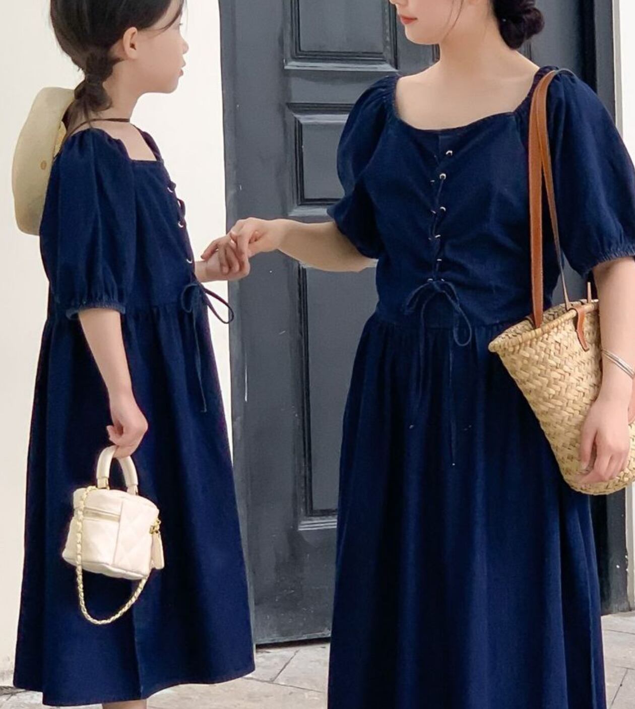 リンクコーデ初めての方も挑戦しやすいシンプルなデニムワンピース‧⁺ ⊹スクエアネックと胸元のレースアップが品良く、裾の広がり的にも動きやすいのも嬉しいポイントです✧*