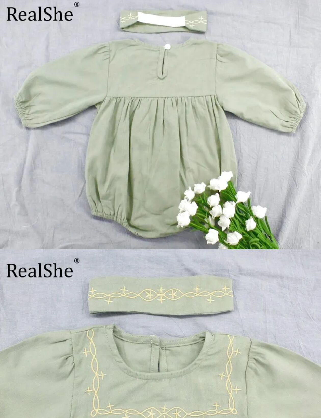 刺繍入ロンパース+ヘッドバンド Set