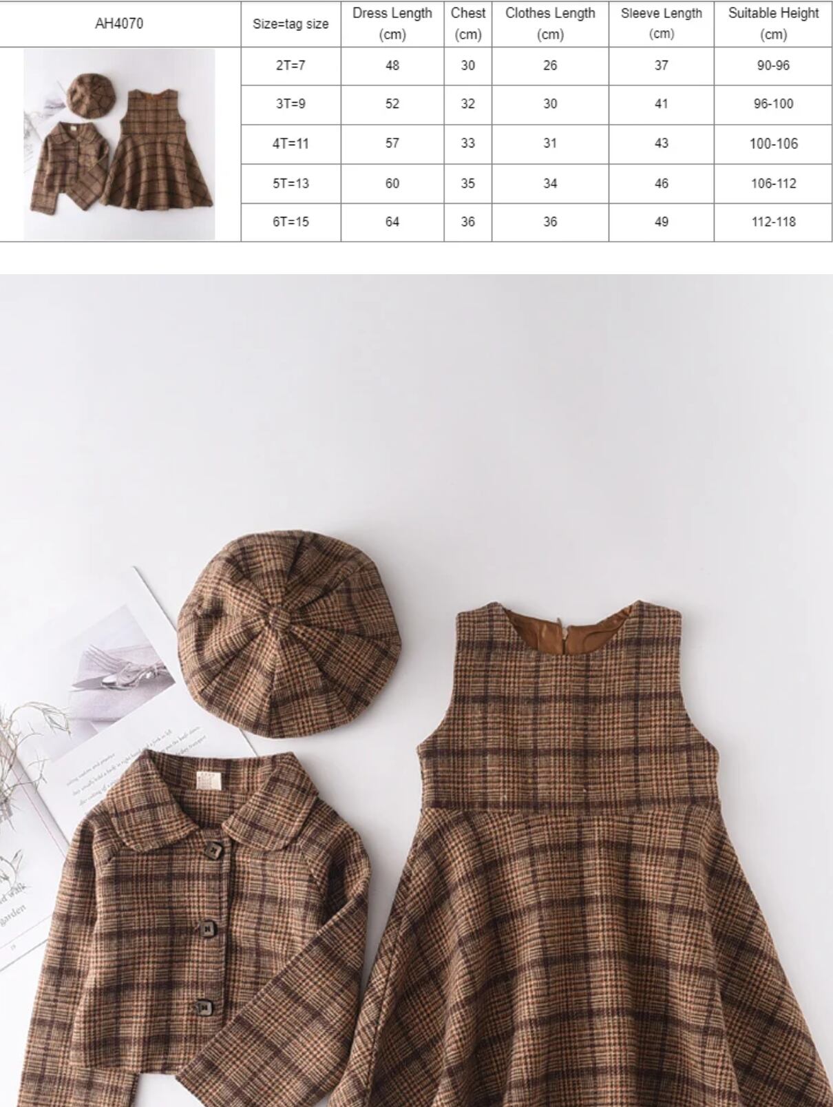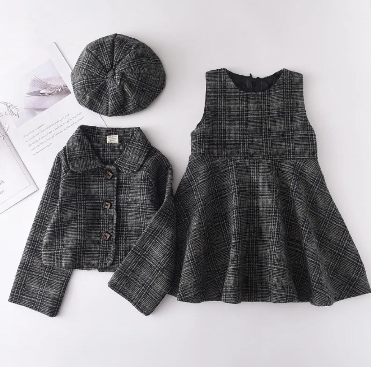 チェック柄ワンピ+ジャケット+帽子 Set