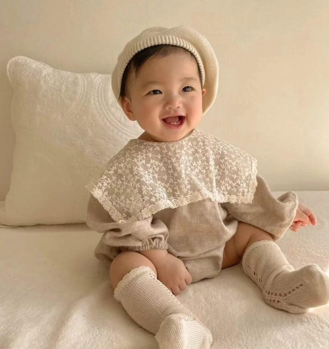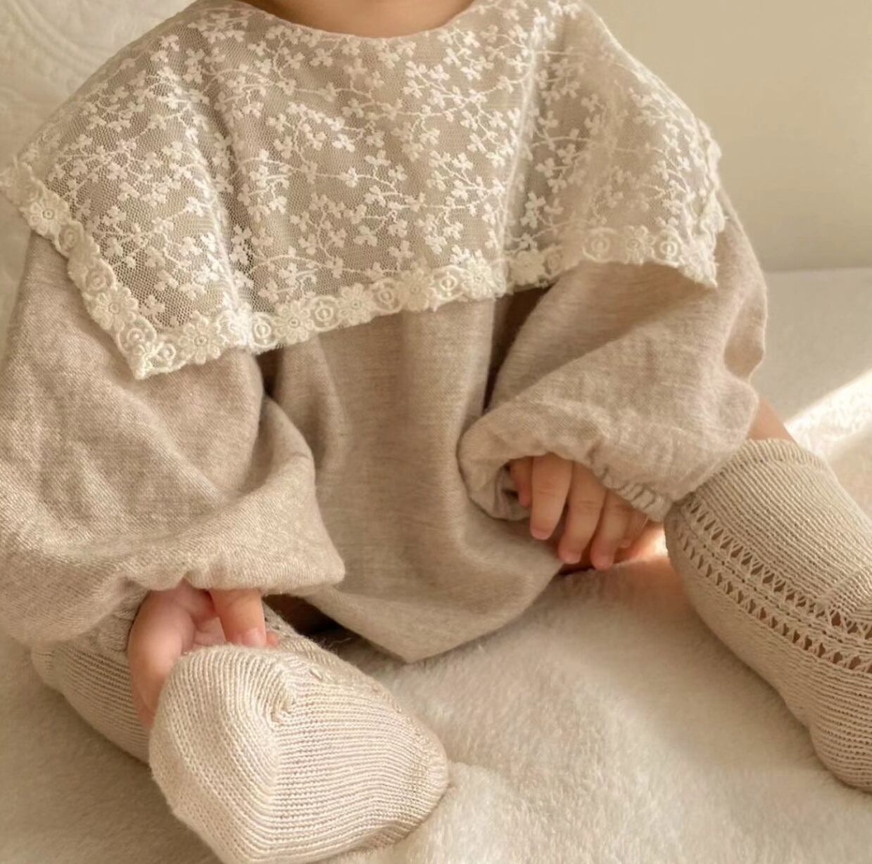 優しい落ち着いた色味のロンパースで若干起毛がかった生地ではありますが、分厚さはなく、春秋に着て頂けます.大きくも上品なレースがポイントです.